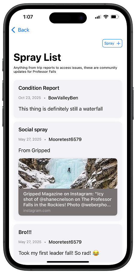 Sloper: Ice & Mixed gives you everything you need to plan your next climb. Explore routes through an interactive map with a detailed 3D view of the terrain. Filter by difficulty & style, or search by name to go straight to a classic. Check recent conditions, browse community insights, and scroll through real photos posted by other climbers. When you’re ready, add your own knowledge: refine descriptions, share updates, and link out to helpful external resources. It’s a guidebook that gets better every time someone ties in.